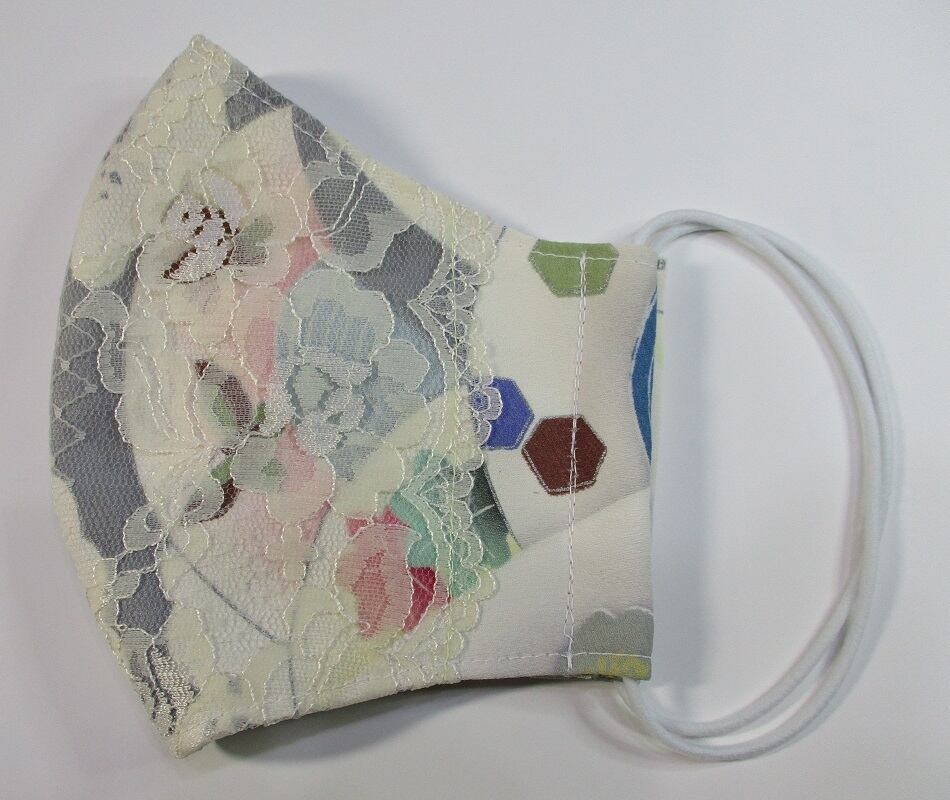 表側はレースと振袖の着物地、内側はダブルガーゼの立体マスクです。
