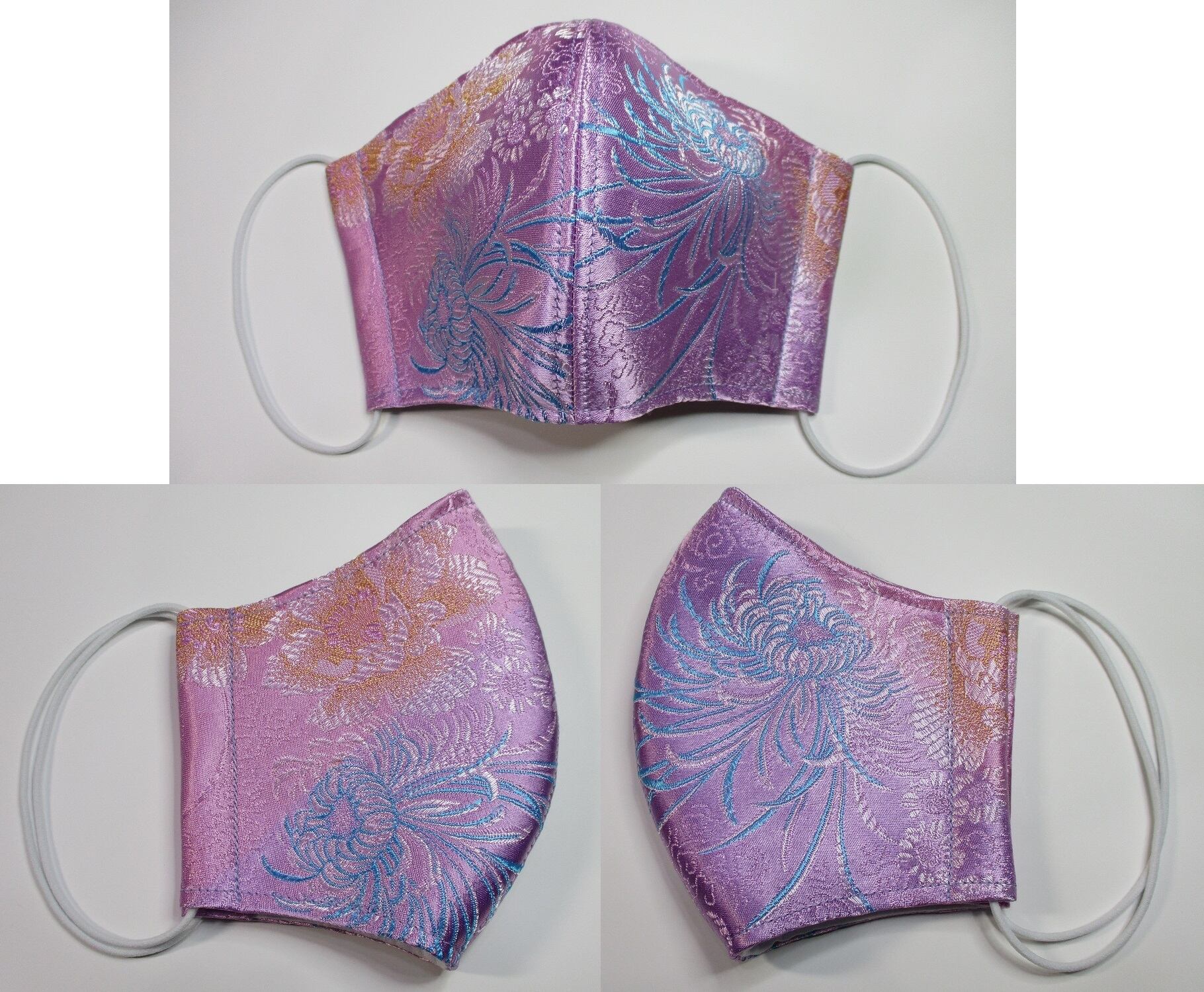 耀くピンクサテン地に菊と思われる花が優美な手作りマスクです。